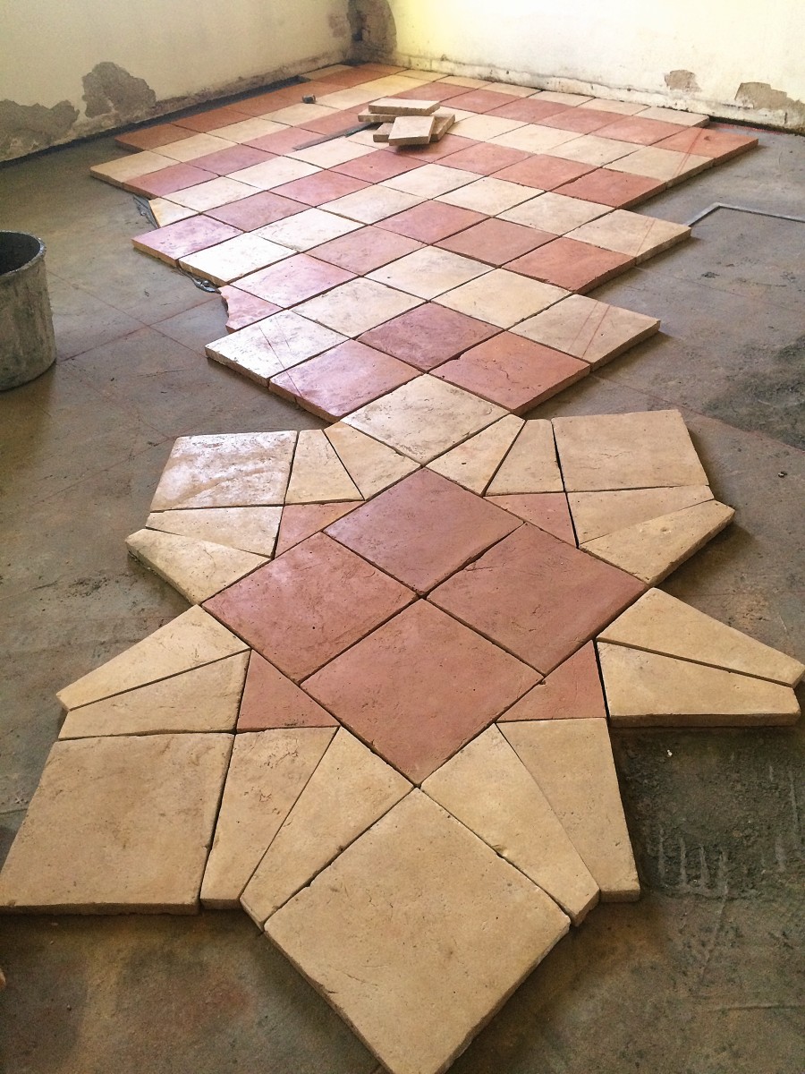 Below: some stages of the reproduction of the old floor of the Villa Cavalli salon (PD). In this case, the extraordinary design of the floor is obtained with only two types of terracotta tiles with different color dough of Antica Fornace Carraro. The mastery is given by the cut of the tiles and the enchanted to obtain a huge almost “optical” design.